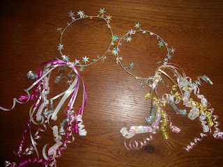 At their little birthday parties, regardless to the theme, all the little girls invited would receive lovely Princess headpieces. I made these from party wire, curling ribbons as well as satin ribbons. If the theme was Little mermaid, the colors from Little Mermaid were used. Halloween - Black, Oranges, and Purples. Beauty & The Beast, 1001 Dalmatians,Christmas, no problem the Crowns, head pieces, what ever they wanted to call them, were always available at Emily & Annie's parties.